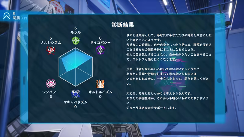 ゲーム内の診断や選択肢により、6つのパラメータが変化。