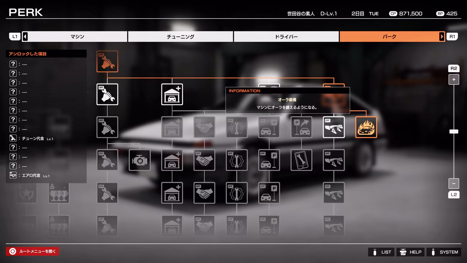 バトルに勝利すると得られるBPを使用して、様々な機能を解放できるツリー型システム。ドライバー能力の成長・報酬アップ・利便性の向上など、恒久的な強化が可能。